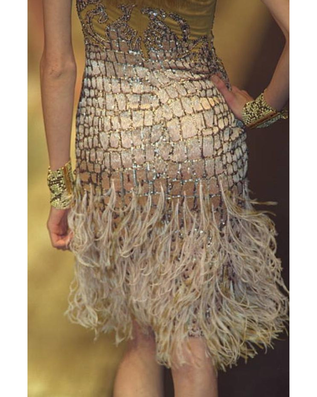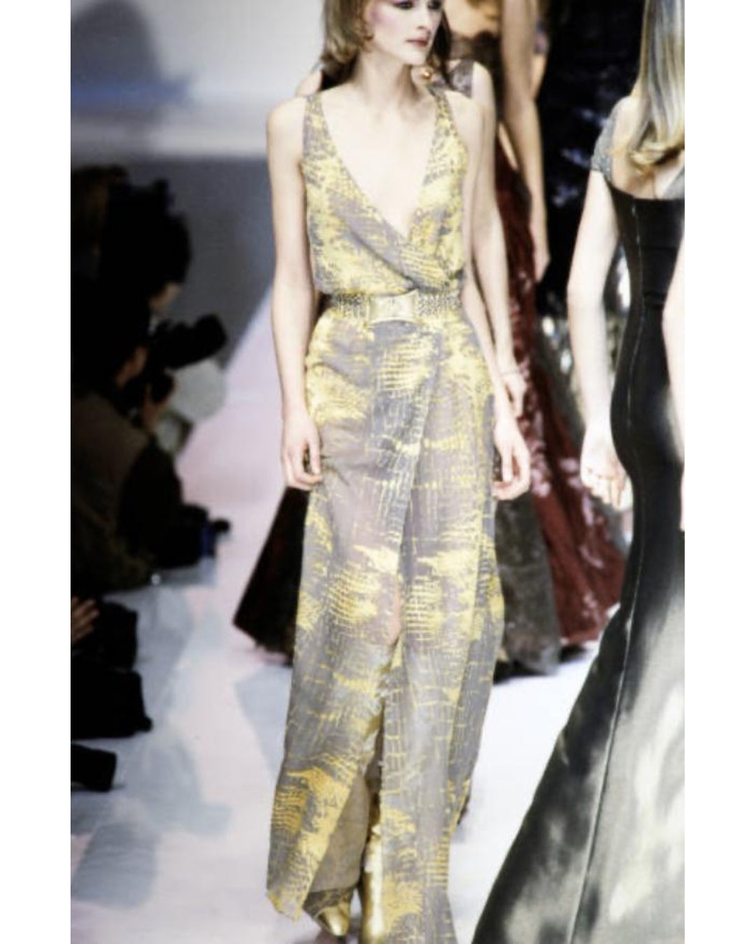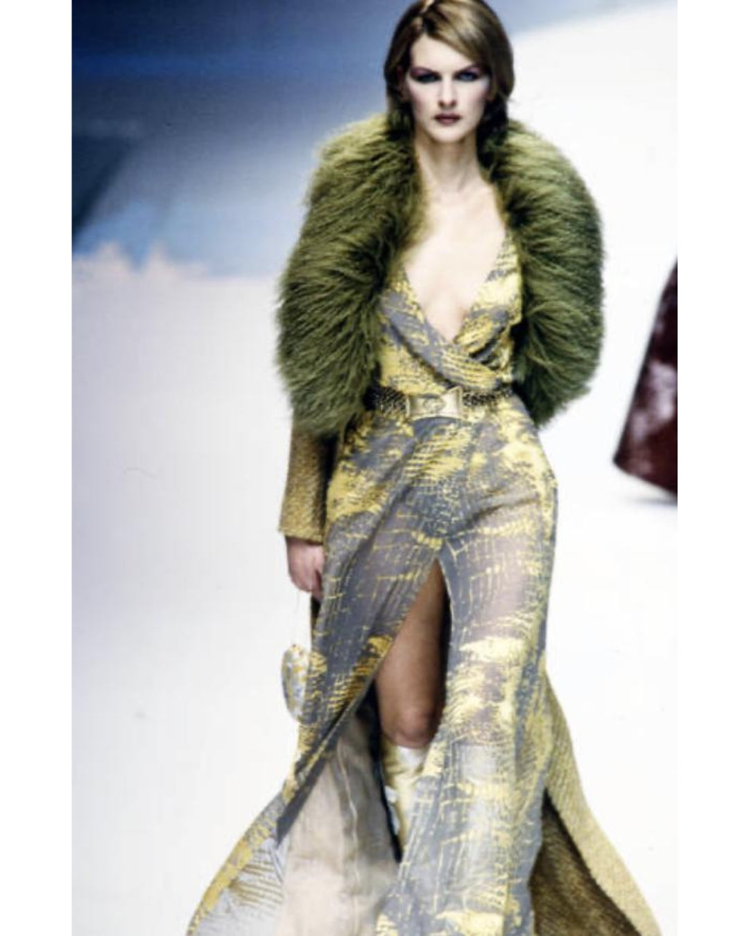 This Valentino Boutique dress is crafted from a lightweight silk-mix devoré fabric. We have seen identical prints in different colourways in both the Fall 1997 and Spring 1998 collections. It has a background of deep burgundy-brown crepe detailed with a textured, scale-like pattern in glossy lilac velvet. The dress is cut to a relaxed, flowy shape with a slash-neckline and pretty low cowl-back. The neck of the cowl has a weight hidden inside the fabric to hold its shape. The cowl also reveals the nude sheer silk crepe lining the back. The waistband cinches the waist only slightly, allowing the top of the dress to drape over the top of the waist. The devoré fabric falls to thigh length and gives way to a sheer panelled flounce of burgundy-brown lace. The dress is lined at the top with chocolate-brown sheer silk crepe but the skirt is unlined. It fastens under the left arm with a hidden tonal burgundy zip and hook-and-eye clasp.