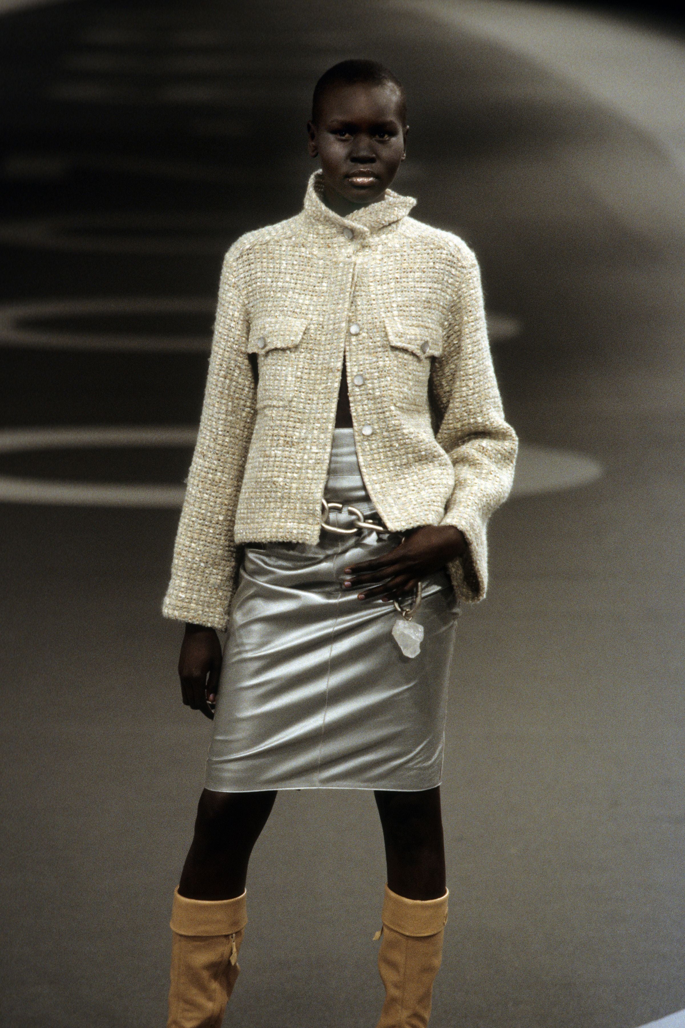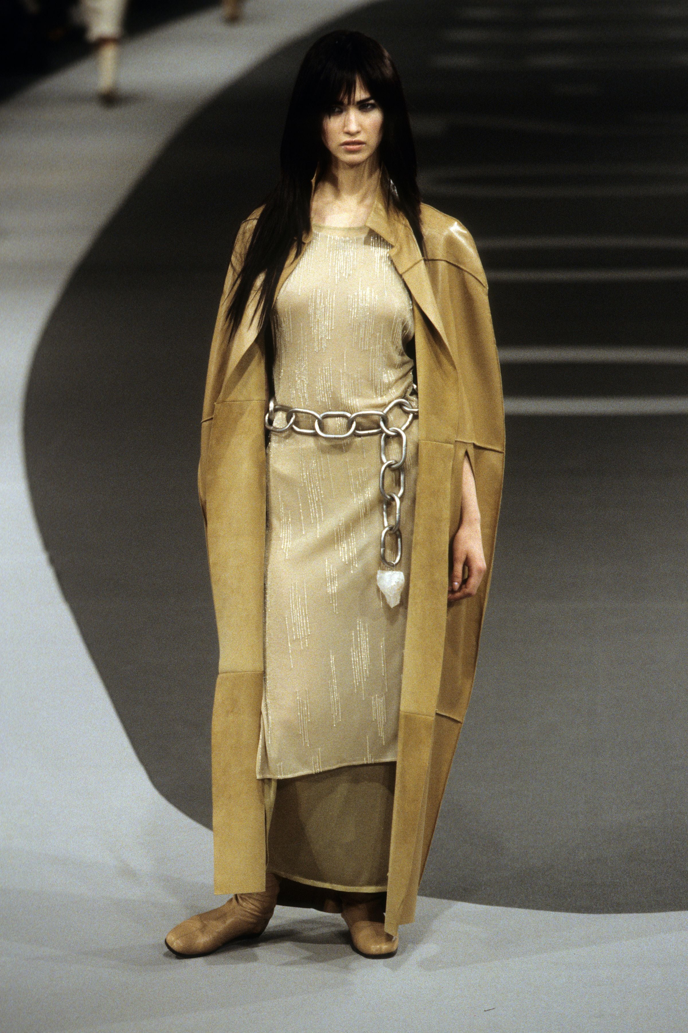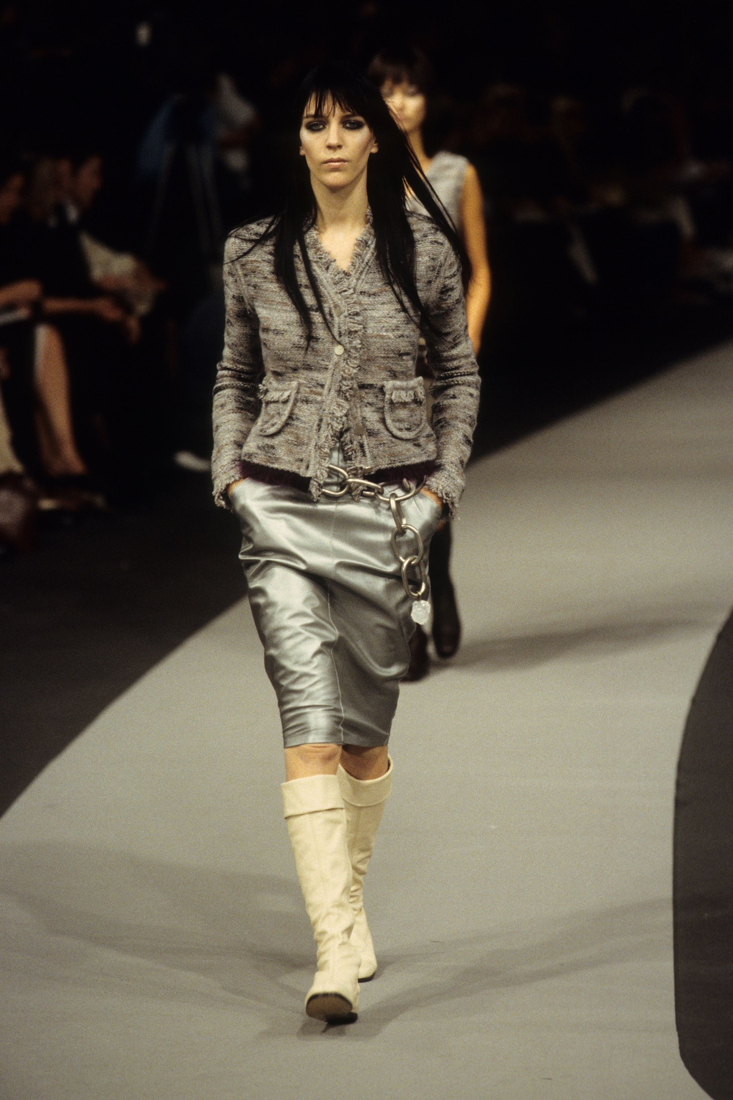 This unusual belt opened Chanel’s Fall 1999 runway presentation (look 1/77), and went on to appear multiple times throughout the collection. This show was memorable for its stark, minimal aesthetic, during which models walked around an oval painted on the floor with “1999” written in the centre. The belt is formed from a weighty silver-toned metal chain. A large piece of white quartz crystal hangs from one end of the belt, secured to it with a silver-toned metal ring. At the other end of the belt, one of the rings is left open so that it can clip onto another and close the belt. This open ring is detailed with two embossed double-C logos.