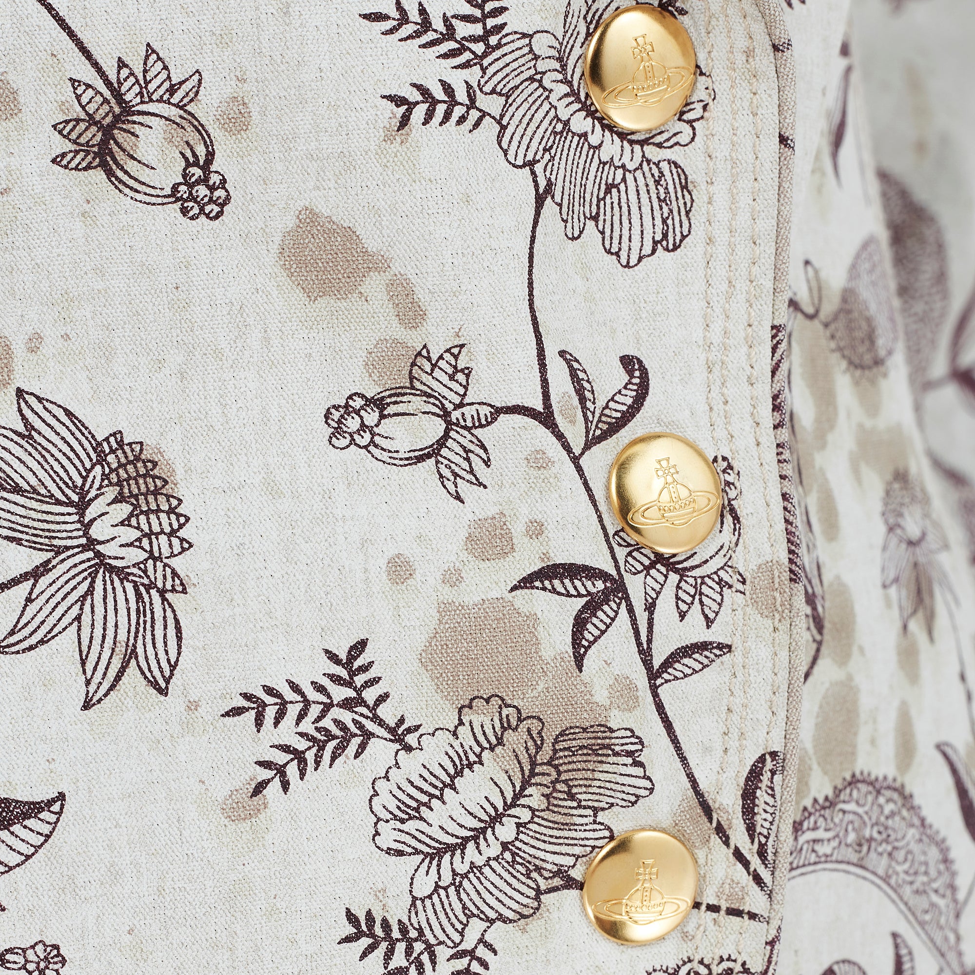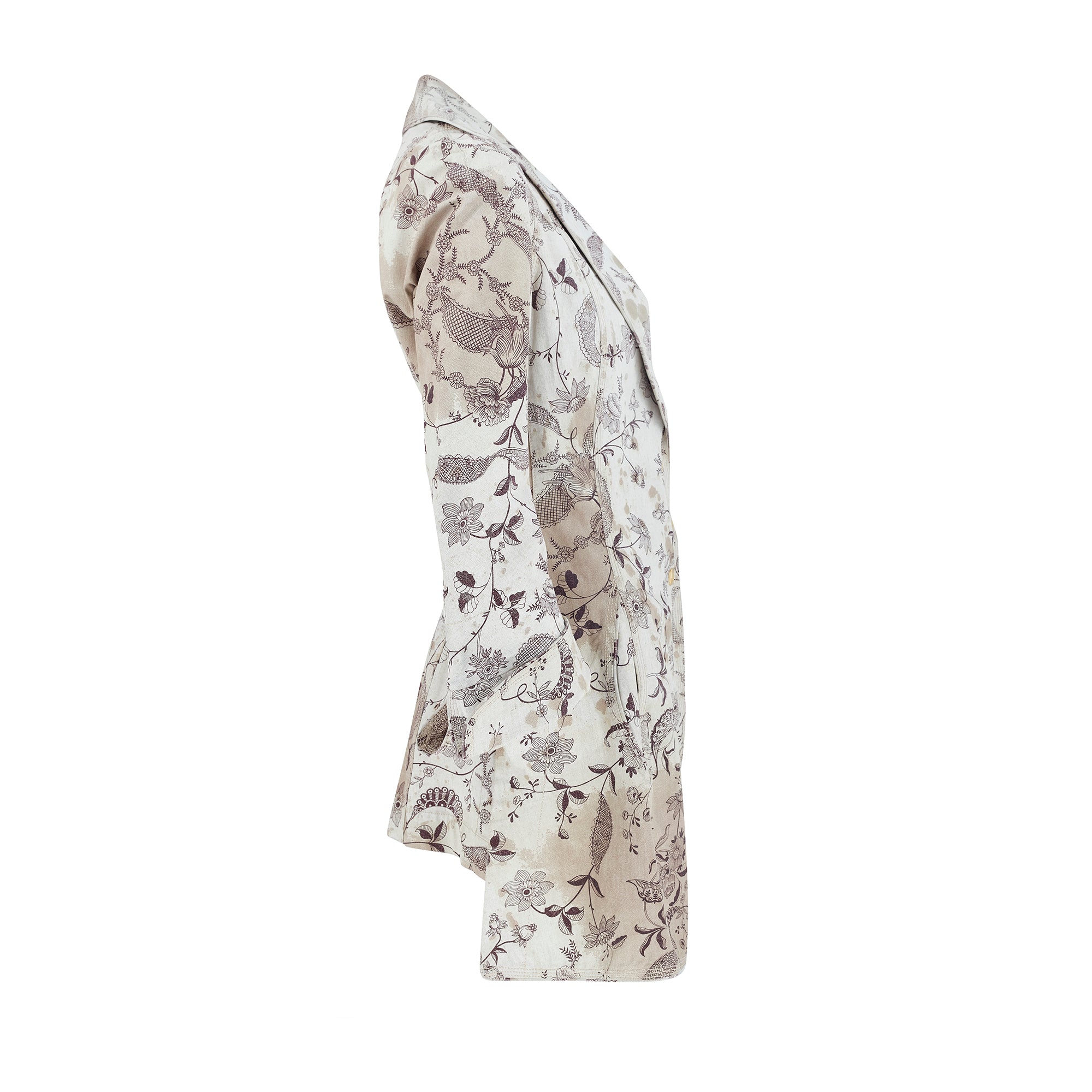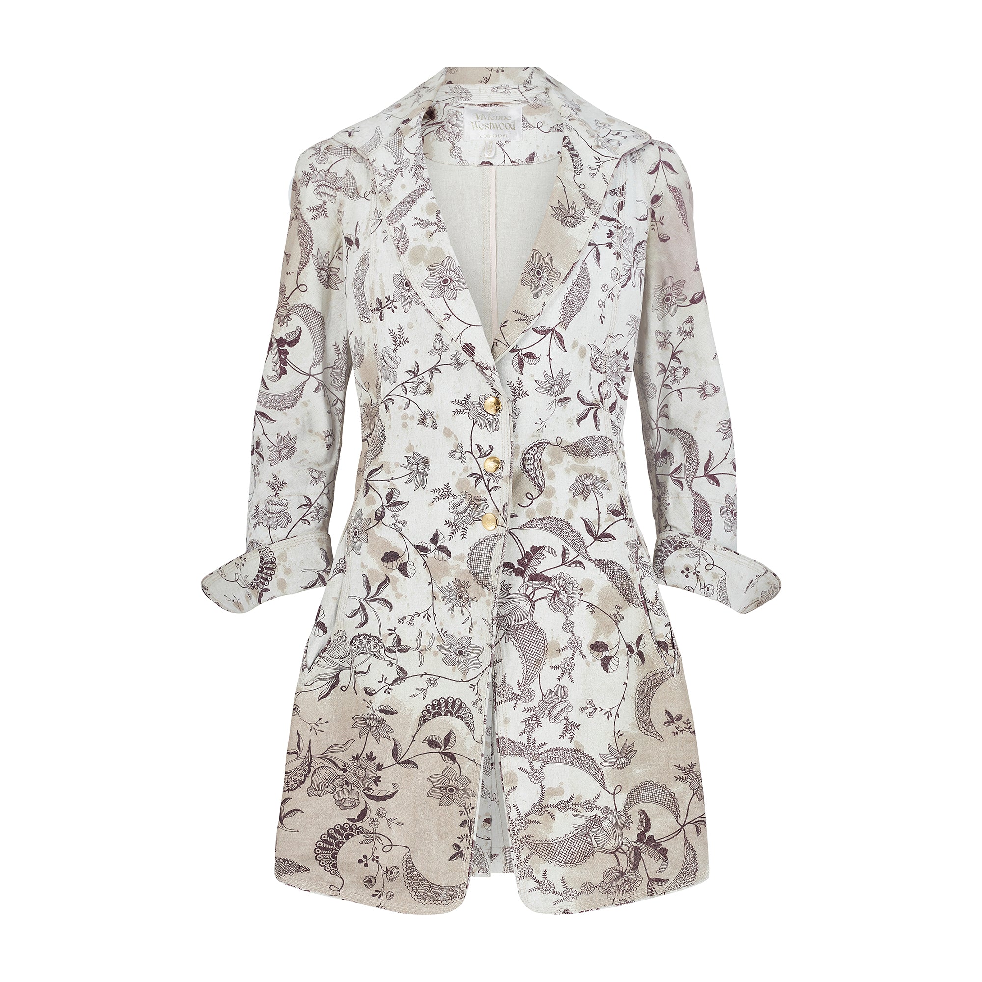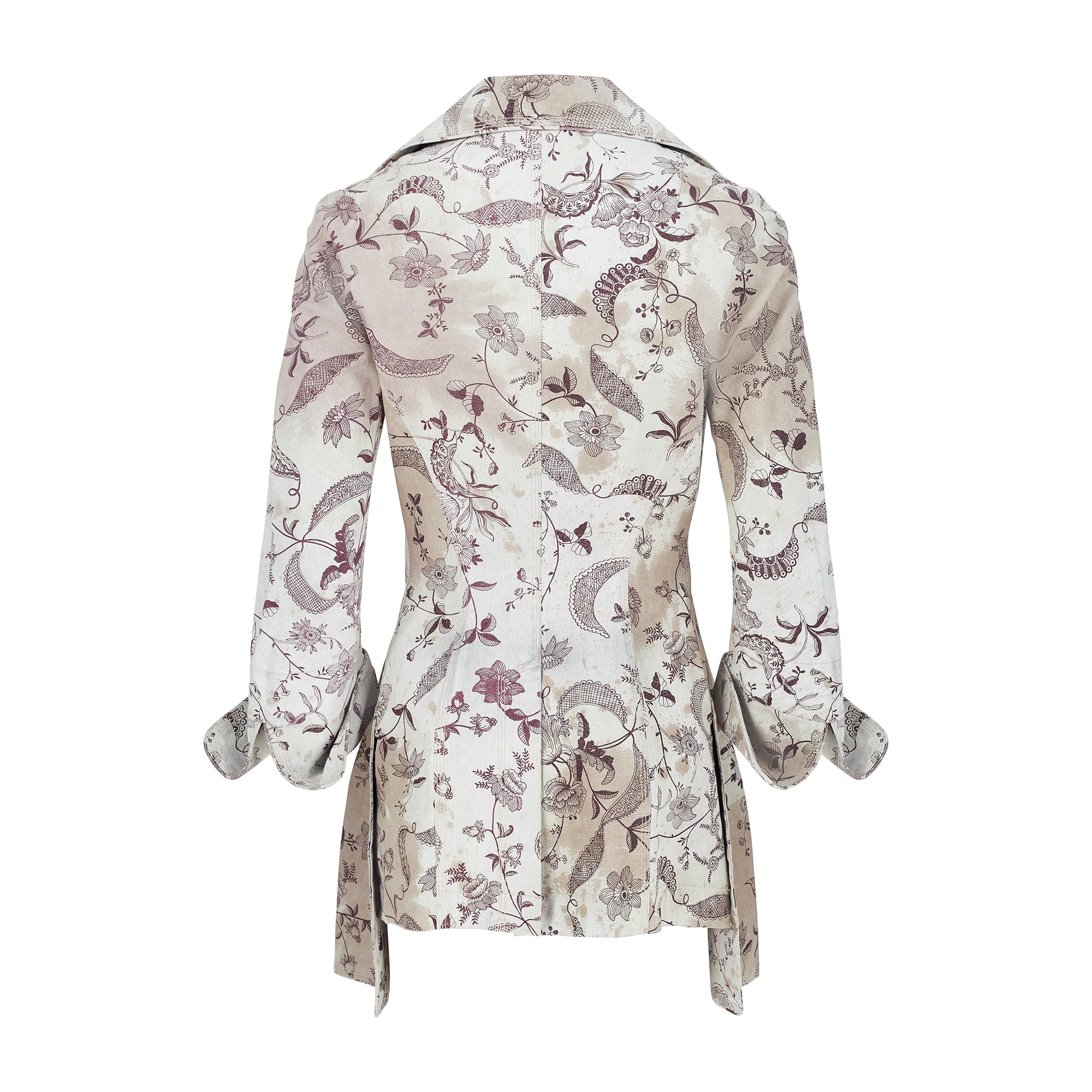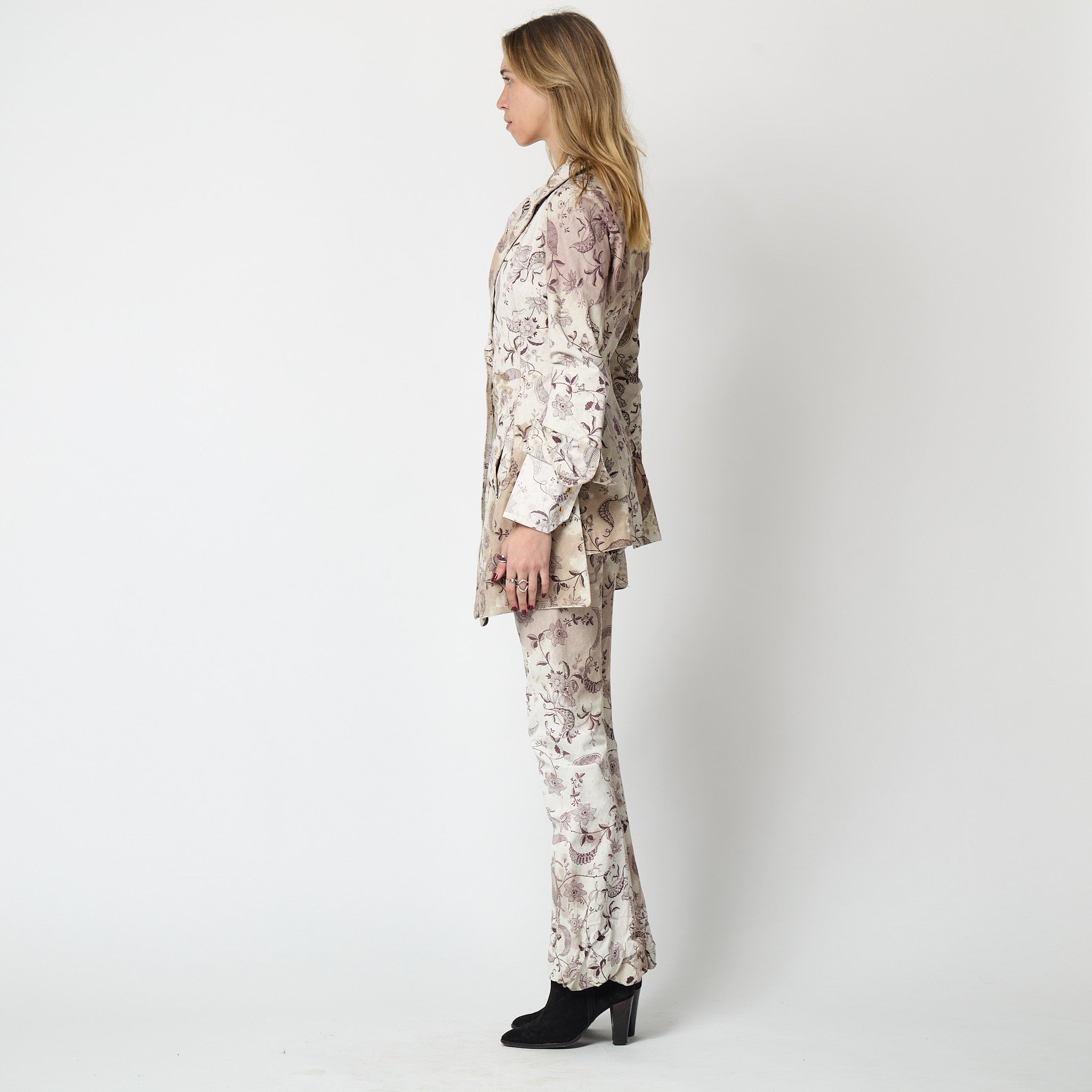 This ensemble is an iconic piece of Vivienne Westwood trophy vintage and would be a great addition to the archive of any collector of this label. Made in Italy, both pieces are tailored from coated linen with a stiff, waterproof effect and a canvas-like handle. The print is taken from an Elizabethan wallpaper design. Rendered in a deep aubergine purple, it shows winding, interlaced vines and fantastical florals. Faded burgundy stains smatter the pale ecru background of the cloth, as though the wearer has spilled glass-upon-glass of red wine whilst dancing. The jacket is tailored to a long length with a nipped-in waist. The cropped panel at the back recalls riding jackets - tailored to fit around a saddle. It has a single wide lapel and in-seam pockets at the front. The jacket fastens with three gold buttons engraved with Vivienne Westwood’s instantly-recognisable Orb logo. The trousers are cut to an extra-long length and are gathered in an erratic manner at the bottom hems so that they pool at the floor around the feet in the deconstructed way that is the brand’s trademark. The waist is narrow and is secured with a hidden white zip and a logo-engraved gold button. There are slip pockets in the side seams and all of the stitching is in pale pink cotton. Both pieces are unlined.