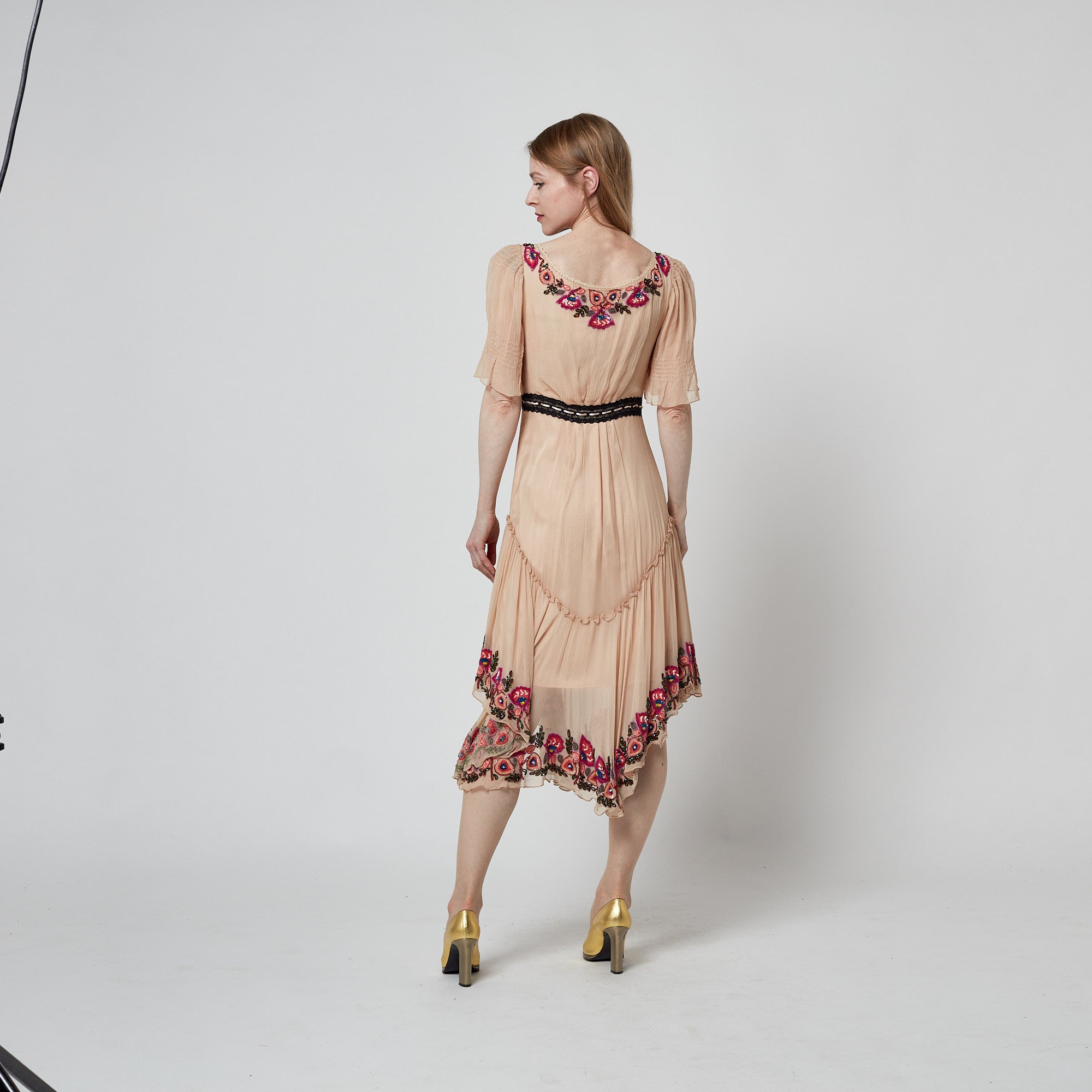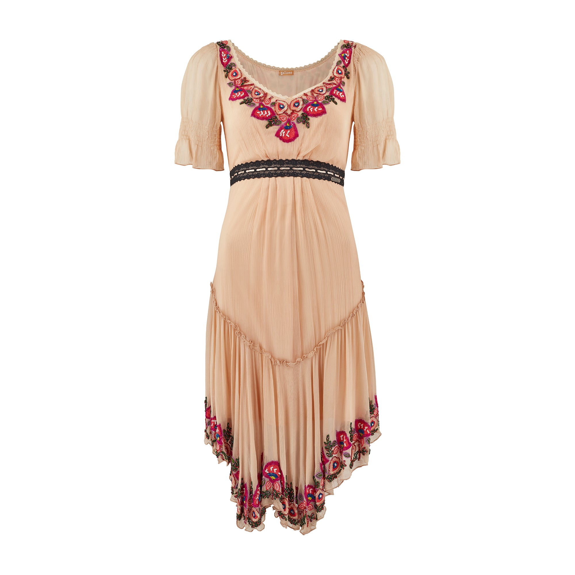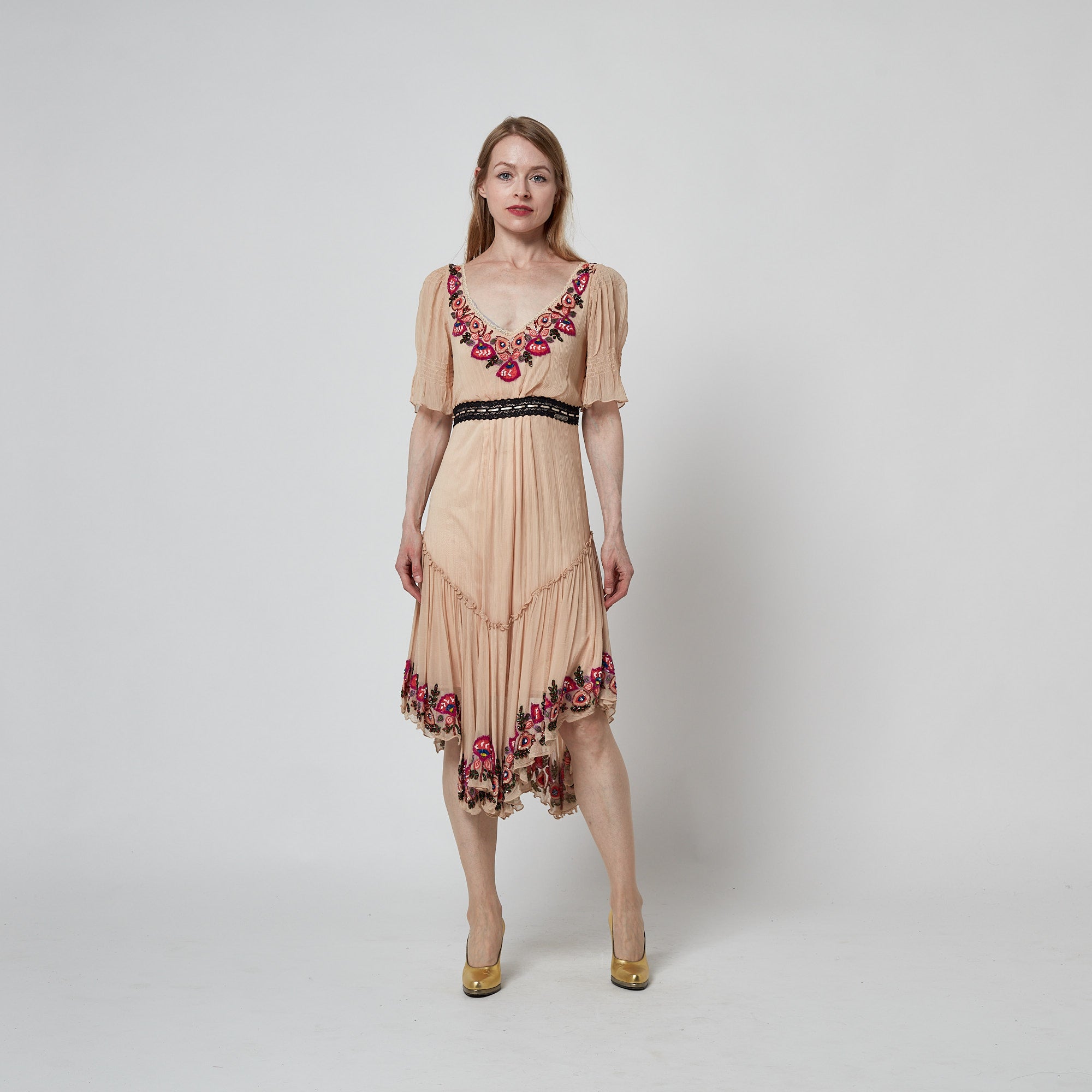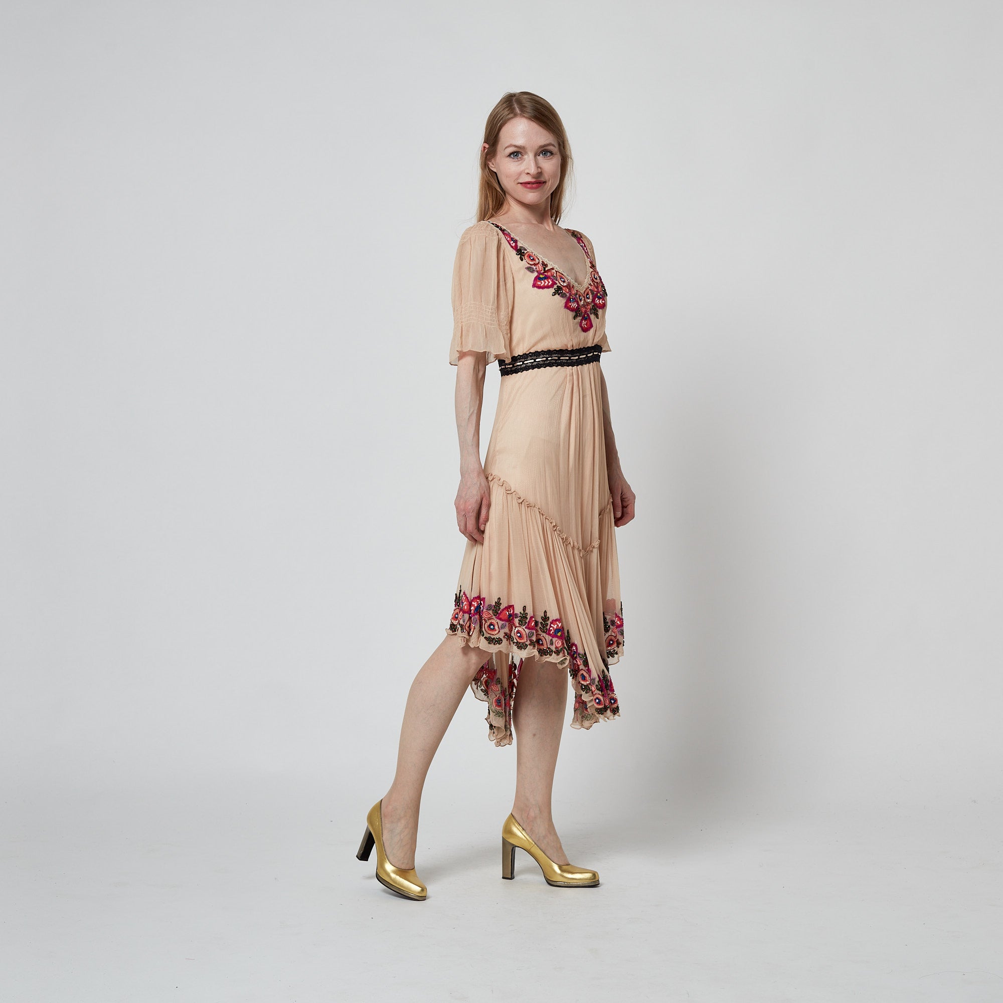 This dress, circa 2007/2008 commercial collection, is tailored from peachy hued, pleated silk chiffon to a short-sleeved midi-style with an elaborate, ruffled handkerchief hem. There is a wide, rounded neckline which is trimmed with pale peach lace. The neckline and bottom hem of the skirt are adorned with intricate, weighty beadwork and embroidery of leaves, flowers and vines in juicy clashing shades of raspberry, coral, forest green, violet, yellow and cobalt blue. The sleeves are sheer and detailed with tonal smocking and ruffled cuffs. The waist is trimmed with black lace woven with peach ribbon; a Galliano embossed metal logo plaque sits atop the black lace. The dress is lined with a smooth peach manmade cloth for a comfortable wear and fastens under the left arm with a hidden tonal zip.