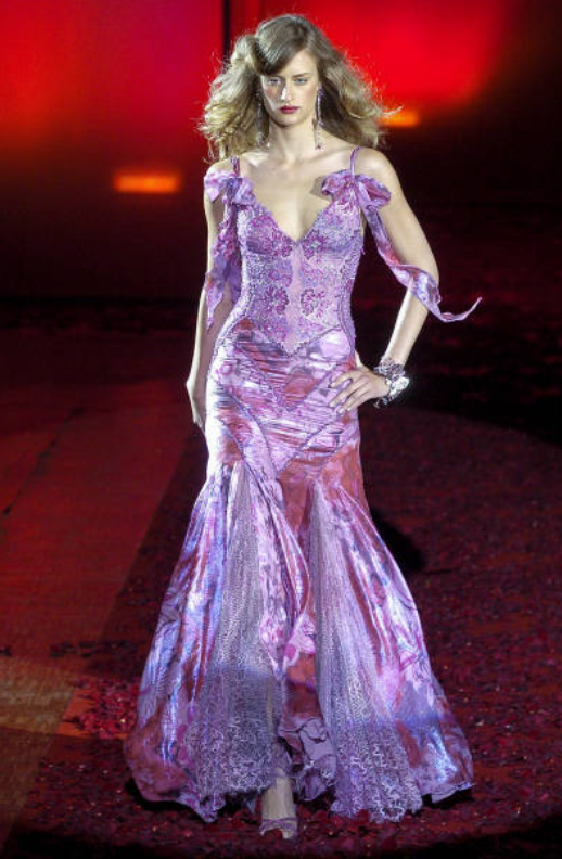 This dress walked the runway as part of Murad’s Fall 2004 haute couture collection. Made entirely from silk in vibrant pink and purple metallic and painterly florals and lace inserts. The dress has a slash neckline and lower, curved back. Contrary to the runway piece, this gown has been adapted to the needs of the house’s couture client who commissioned it. Short flutter sleeves have been added, crafted from a tonal pale lilac-pink mesh and trimmed with coated, stiff ribbons in coordinating pink and purple cloth which tie prettily at the shoulders. The mesh is embellished with blue and purple sequinned flowers and trimmed with rows of sequins at the cuffs.