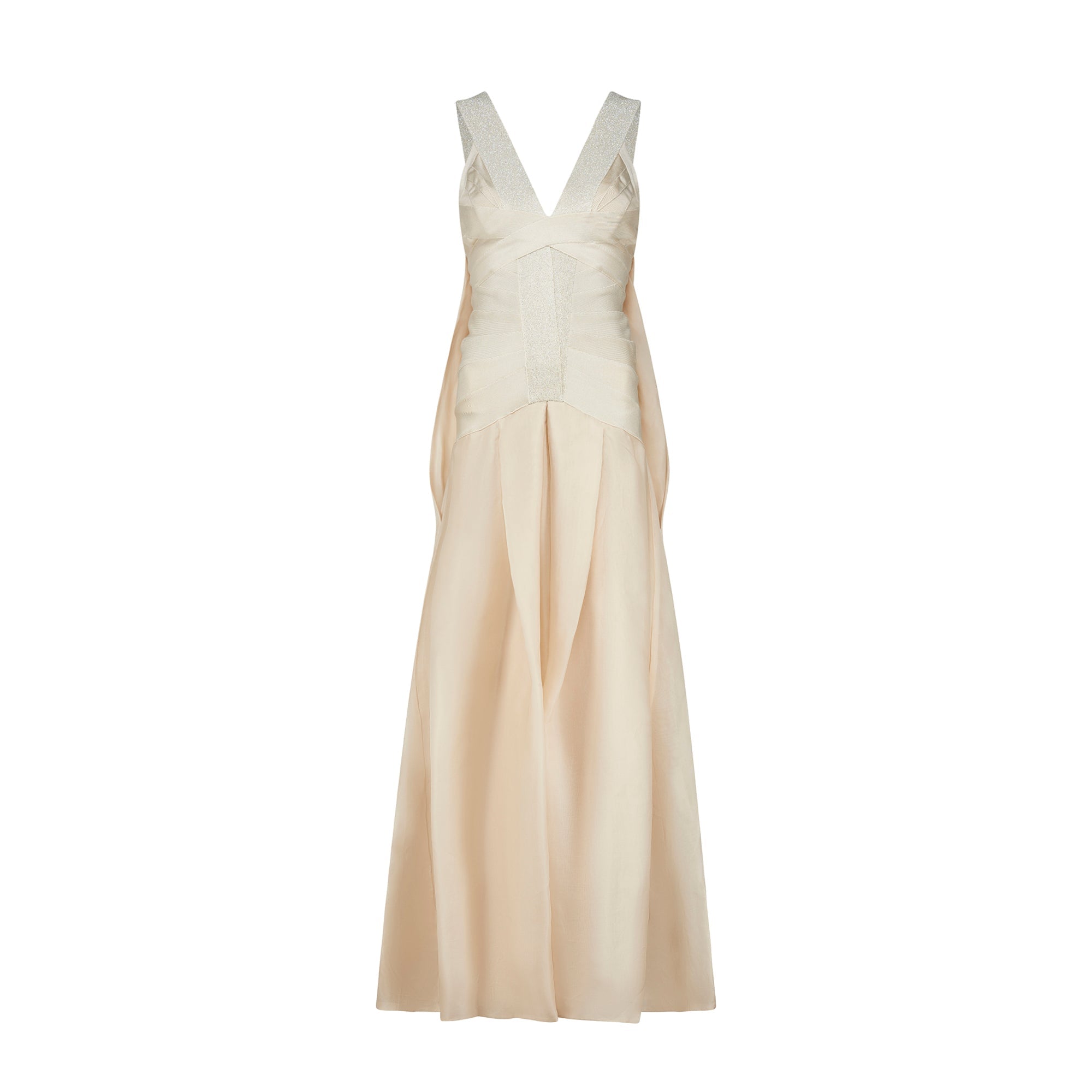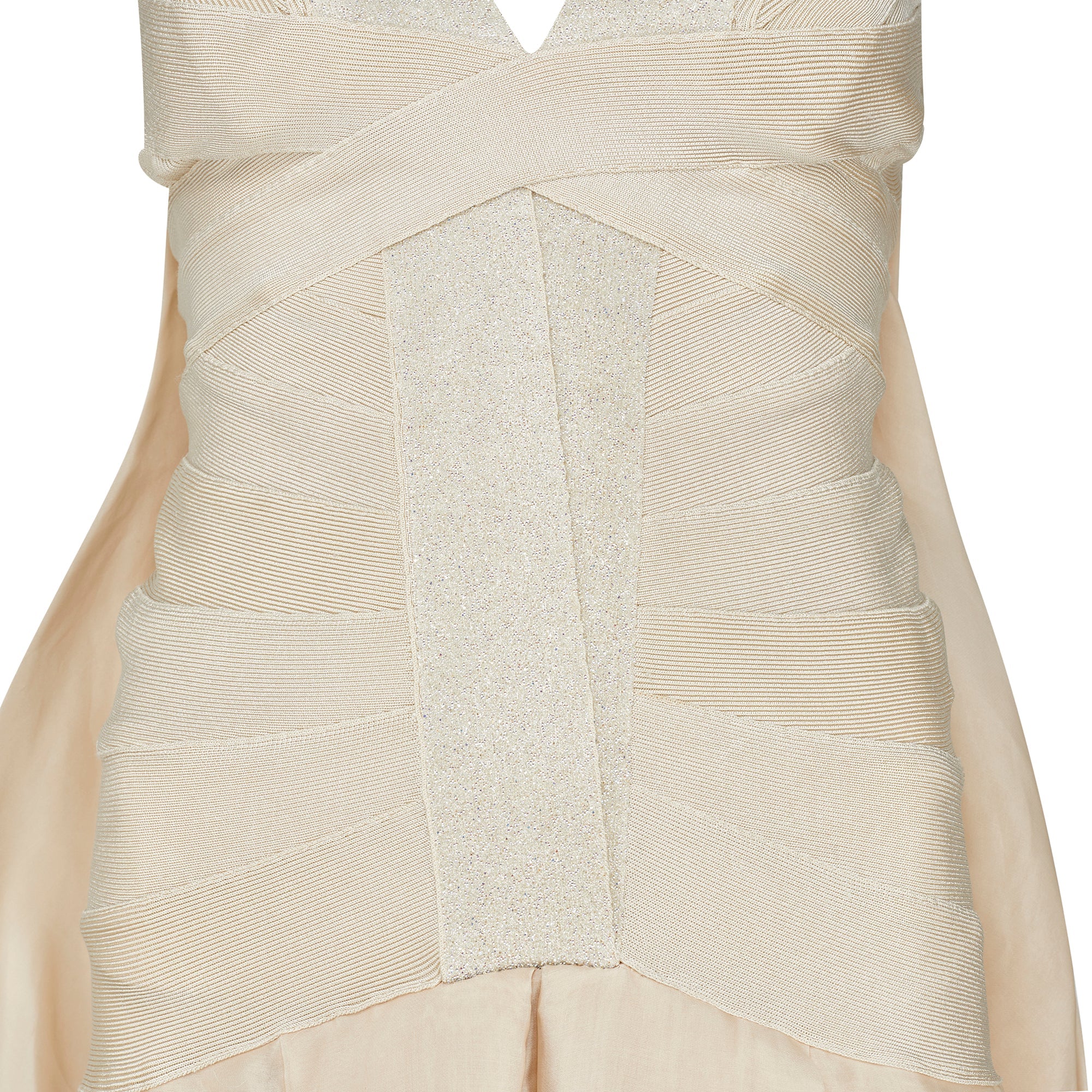 Champagne-toned maxi dress from Max Azria's debut collection for the Hervé Léger Fall 2008 runway, conceived as the house’s sculptural take on a bridal silhouette. Hervé Léger rose to prominence in the late 1980s and 1990s with his innovative bandage dresses, made from stretch panels inspired by couture techniques. The upper body is constructed in classic bandage style, tightly contouring the figure like a corset with a starburst-like arrangement of panels that converge at a glittering bandage strip that acts as an anchor. This embellished band becomes the shoulder straps, framing a V-neckline. Below the structured bodice, the dress transitions into a voluminous, softly pleated skirt crafted from substantial silk chiffon in a tonal champagne hue. From the back, the skirt appears to begin higher on the body, but this effect is created by an attached train or cape that drapes over the skirt. Falling from the shoulder blades, it descends from the same shimmering bandage that forms a V-shape at the back and is folded into a bow at the top of the train. The skirt is lined with a tonal silk slip, while the bodice remains unlined, relying on the dense bandage mesh for structure and coverage.