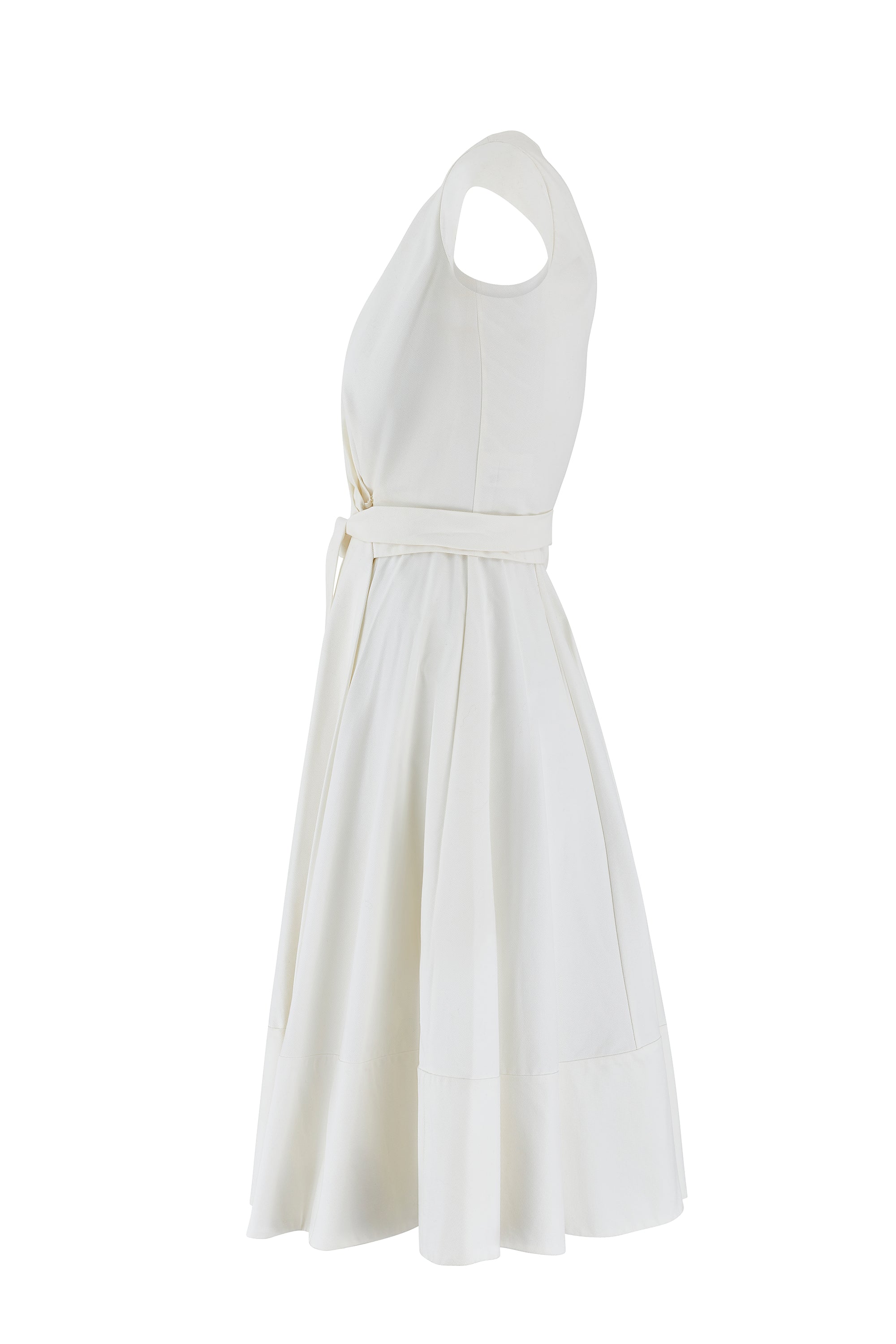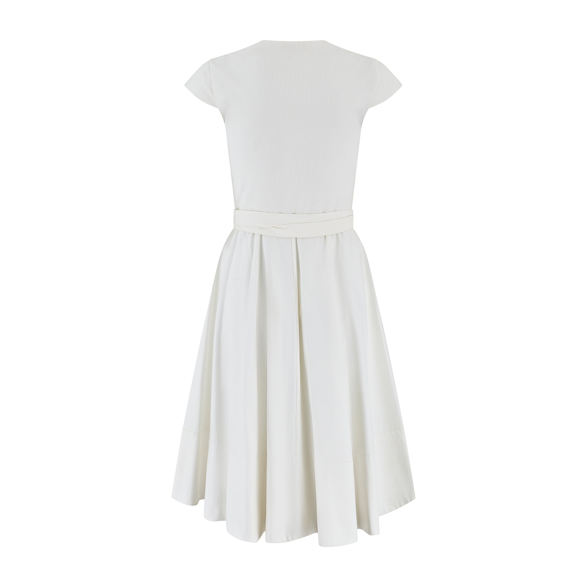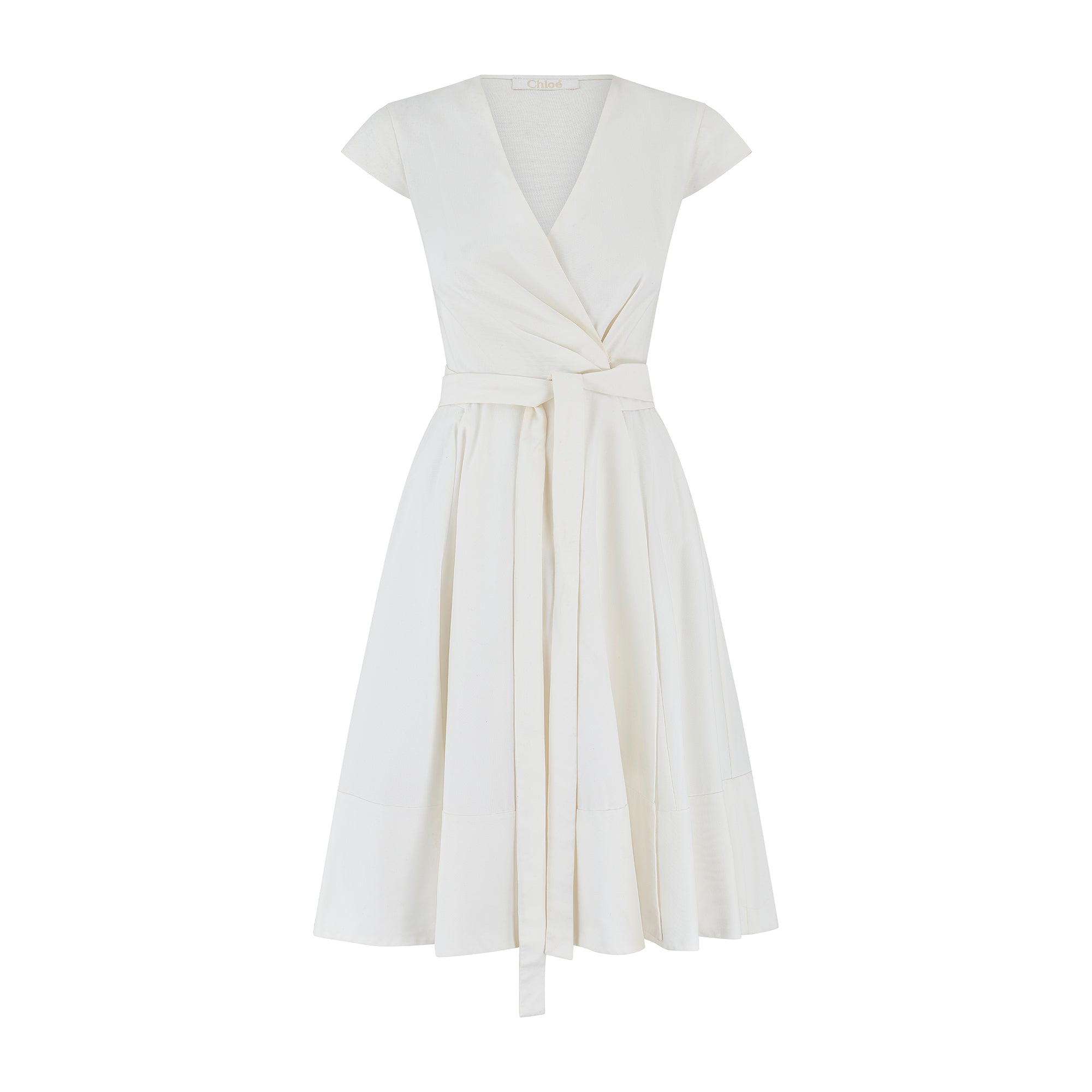 This timeless dress was designed by Hannah MacGibbon for the Chloé Spring 2011 collection and was look 14/31 on the runway. The dress is tailored from a crisp and thick white cotton with a hint of stretch. Tailored to a pretty wrap-style with a full skirt, this is a feminine piece that recalls classic 1950s shapes. It has small cap sleeves which add to the vintage feel. There is a sensuous low V-neck formed by the wrap-front. It ties at the waist with a coordinating thick cotton tie and a hidden snap closure. The skirt is generously cut to a full circle shape which makes it playfully full and flippy and a joy to wear. The dress is unlined but has a long bottom hem of doubled-up fabric.