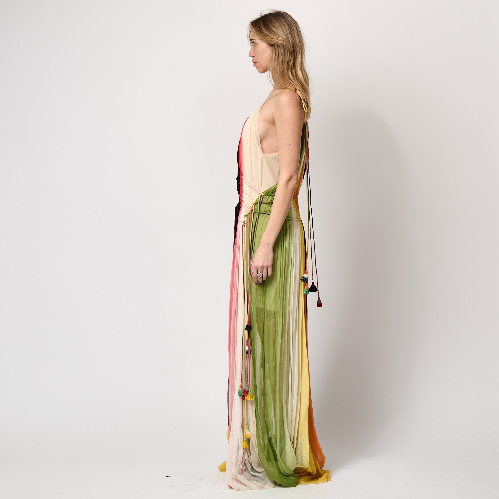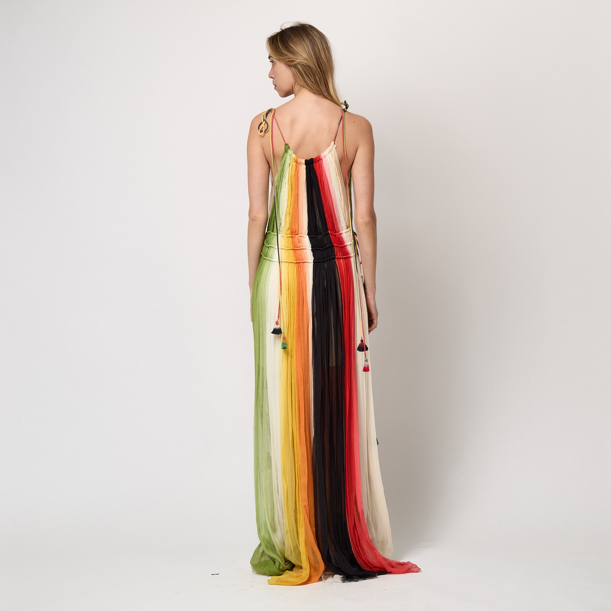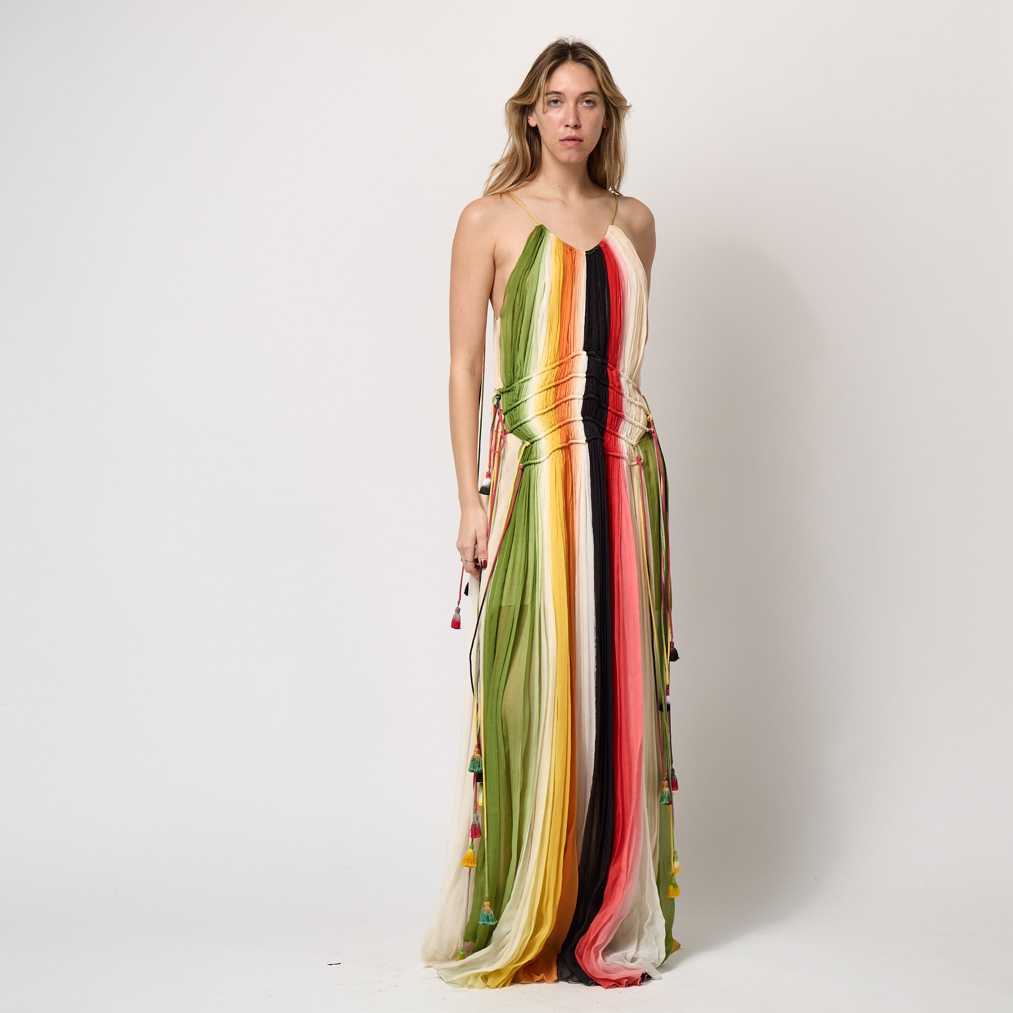 Made in France, it is tailored from floor-length plumes of chiffon that were hand dyed in Lyon in stripes of dark peach, sage green, black and cream that fade into each other with an ombré effect. At the waist, it is cinched by five drawstrings threaded by ombré dyed rope in hues that match the dress. These are knotted at each side of the waist and fall down the skirt, finishing at different lengths and each adorned with a tassel in a vibrant painterly tone. The straps are formed from the same ombre ropes, they form a drawstring through the neckline at the front and back. Again, playful tassels hang from the shoulder of these straps. The generously cut skirt kicks out as the wearer walks, with the sheer cloth and ombré dye adding a whimsical, festival feel that plays to Chloé’s reputation for bohemian luxury. This dress is fully lined in pale champagne silk.