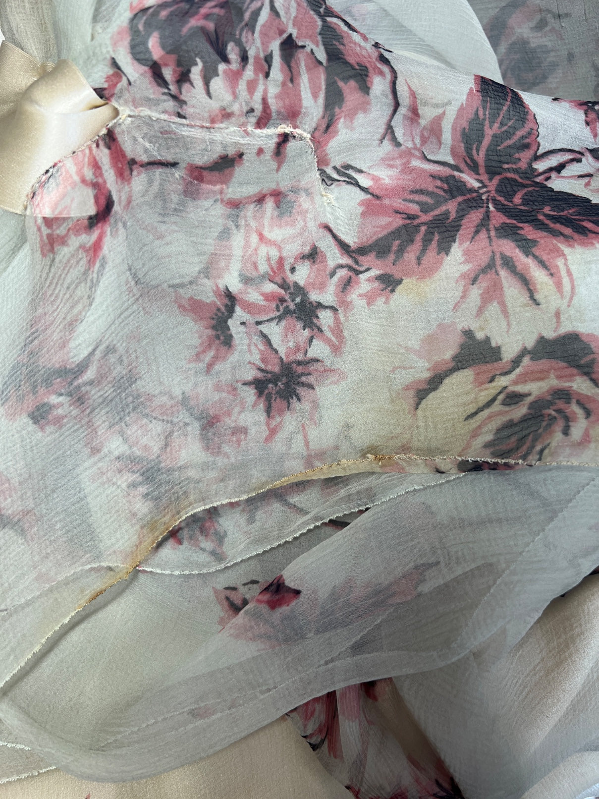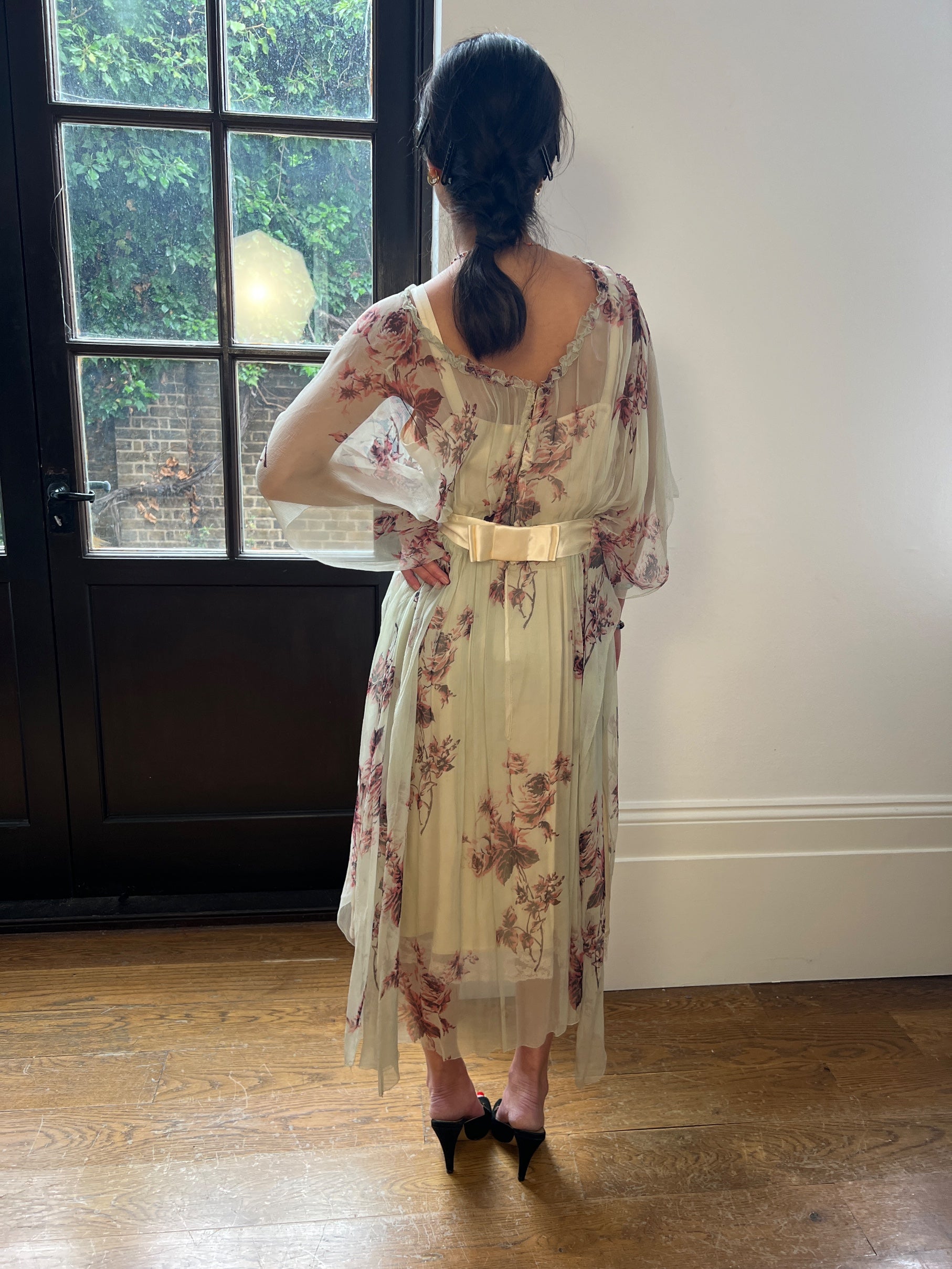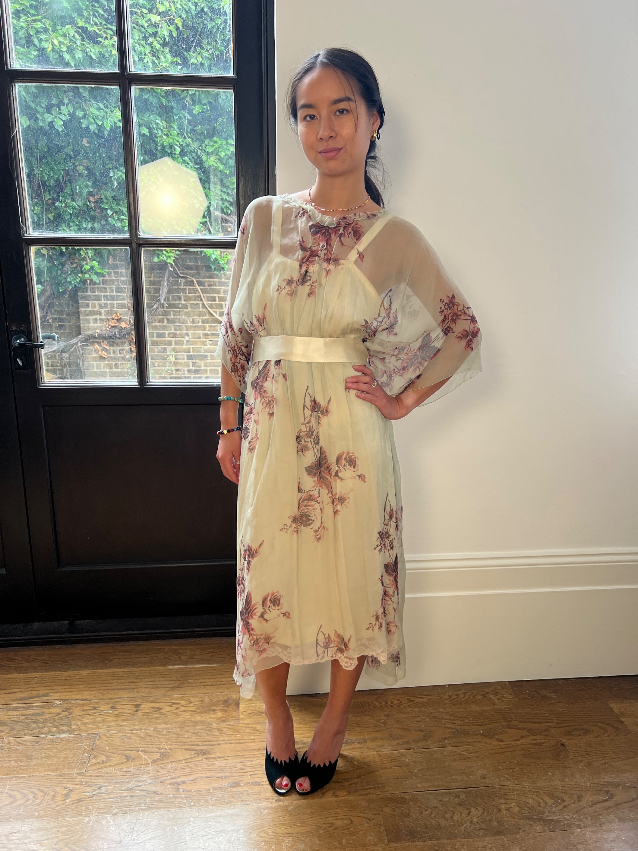 The top dress is crafted from sheer silk chiffon which is a blue-seafoam green hue and detailed with a contrasting fuchsia and chocolate brown rose print. It is cut to a mid-length tunic silhouette with a flared, handkerchief hemline. The neckline is trimmed with sheer ruffles and forms a soft V at the back of the neck. It is cinched at the waist with a wide cream silk satin belt which is adorned at the rear with a large, flat bow. As the original silk belt had perished, Circa made an exact copy from the original design. The dress fastens at the rear with multiple hidden hook-and-eye clasps. but could in theory be worn either way around due to the tunic style. Fully restored by our in-house atelier, we matched this dress with a French haute couture cream silk crepe slip dress which has a lace hem line; it is slightly later - perhaps mid to late 1930s.